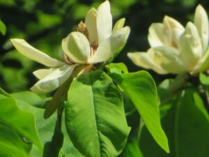 新芽が出たと思ったら、あっという間に大きな葉っぱに育ち、そして今、高い木の枝先に次々と花が咲いています。